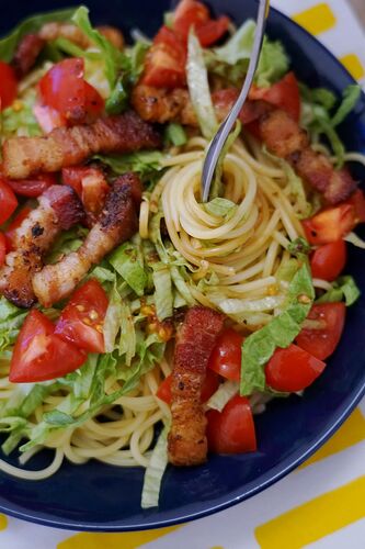 のっけめん100ぜんぶ作るプロジェクト 49皿目『ベーコン、レタス、トマト』 3か月以上ぶりののっけめんになってしまいました…。 BLTサンドイッチのパスタ版。にんにく醤油味パンチ効いてておいしい! ベーコンはブロックのを使ってみたけど、バッチリでし…