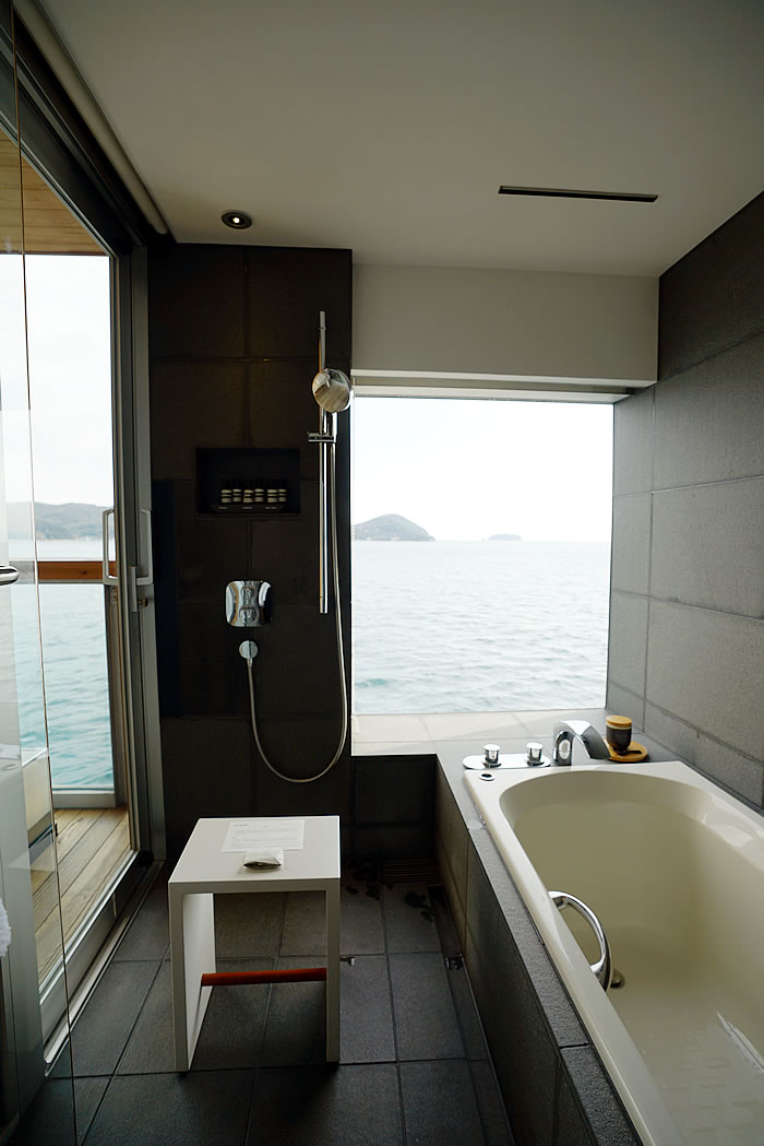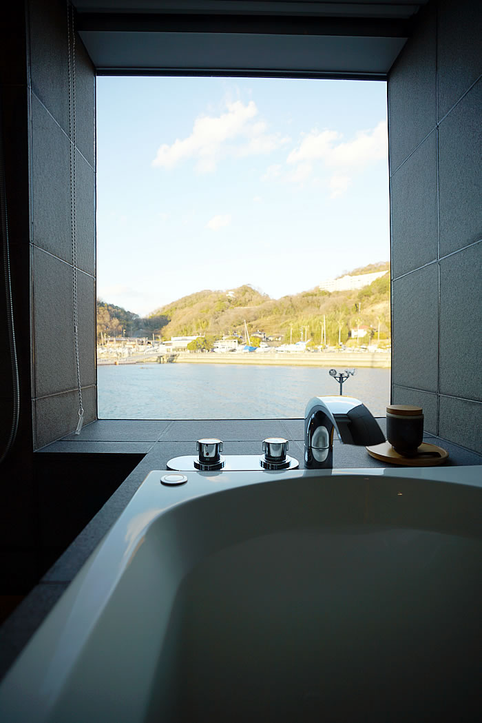 窓が大きく切り取られていて、お風呂に入っていると海とつながる!