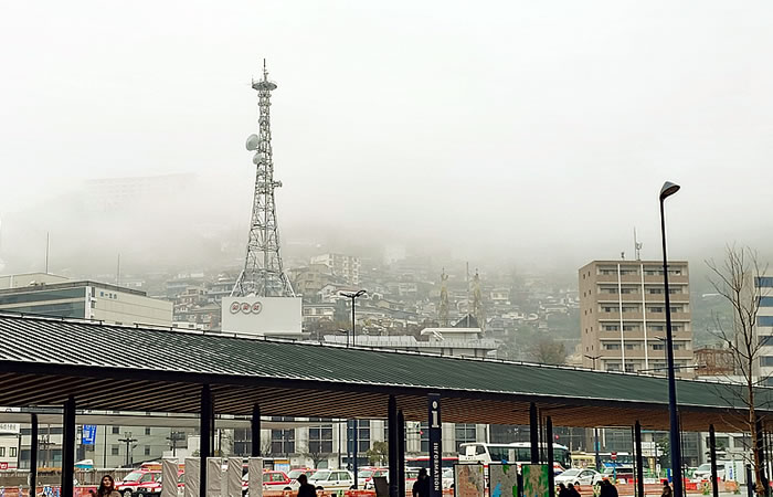 写真右側、年季の入った建物『交通会館県営バスターミナル』から長距離バスに乗るんですが。