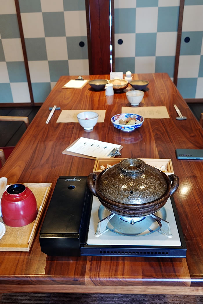 お出汁がセットされていて、沸いたら 自身で手前の木箱に入っている味噌玉と豆腐などの具材を入れて完成させる参加型^^